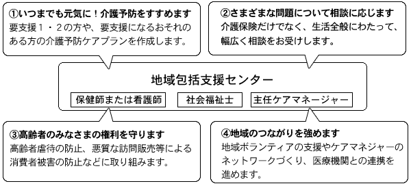 平成18年4月から、高齢者が住み慣れた地域で生活を続けられるよう、介護保険やその他のサービスを上手に利用するための様々な支援を行う「地域包括支援センター」を地域ケアプラザや特別養護老人ホームに設置しています。「地域包括支援センター」には保健師または看護師・社会福祉士・主任ケアマネジャーなど専門のスタッフを配置し、各種相談や介護予防のケアプラン作成などに応じています。