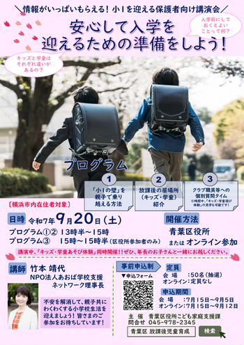 ① | 「小1の壁」を親子で乗り越える方法 | 区役所50名(申込多数の場合は、抽選) またはオンライン配信(定員なし) | 13時半~15時 |