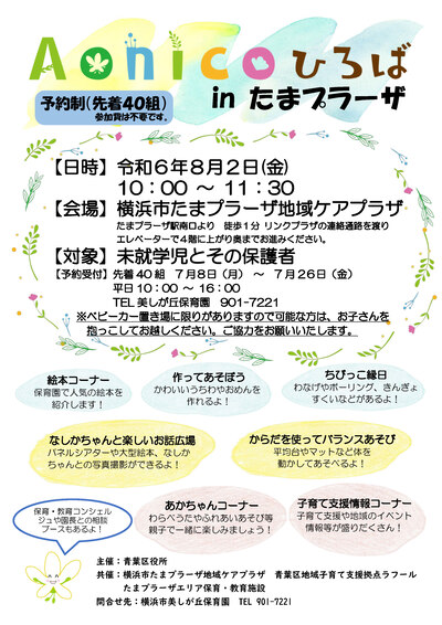 【申込】先着40組 7月8日(月曜日)~7月26日(金曜日)平日10:00~16:00 美しが丘保育園 ☎901-7221