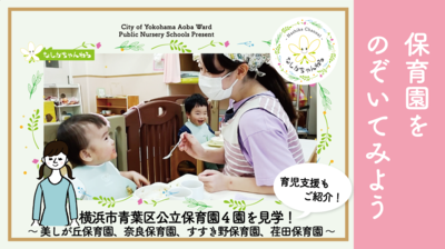 横浜市青葉区公立保育園4園(美しが丘保育園、奈良保育園、すすき野保育園、荏田保育園)の園紹介です!園で行っている育児支援事業の紹介もしています。(2023年5月配信)