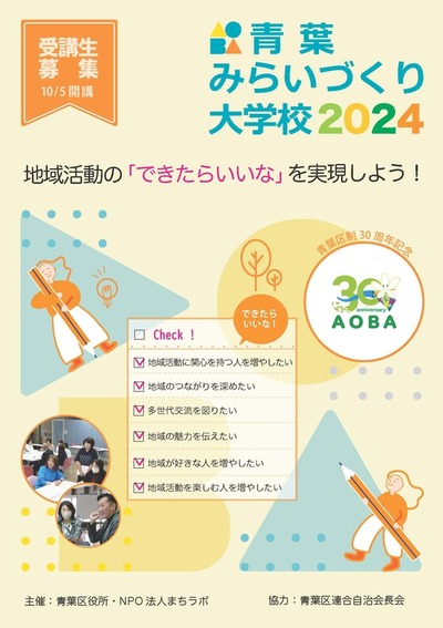 青葉みらいづくり大学校2024は、地域活動の裾野を広げるために「参加したくなる」地域活動について探求し、「できたらいいな」を実現するための講座です。