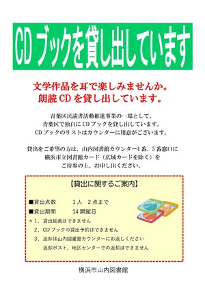 令和3年8月から青葉区読書活動推進事業として、山内図書館で有名文学作品の朗読を録音した「CDブック」の貸出しをしています。小さな文字が見えにくい方や忙しくて本などを読む時間がない方でも、音楽を聴くように読書を楽しむことができます。