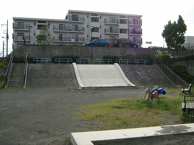 法面にすべり台があります。おしりにダンボールを敷いてGO!