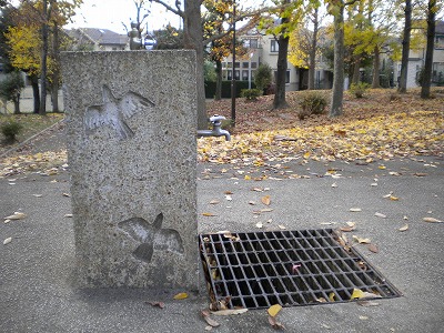水飲み場の石には鳥がデザインされています。春はサクラがきれいです。