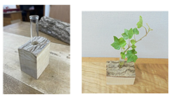 間伐材を再利用したワークショップ。好きな程度にやすりをかけ、自由にイラストを描いて一輪挿しを作ります。(無料・数量限定)
