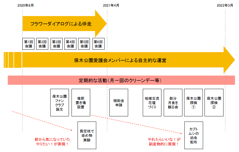 同時期に、そのような課題を持ちながらも、意欲的に活動をはじめていた保木公園の存在を知り、その活動の伴走支援を行うとともに、活動の取材を続けました。保木公園は愛護会だけでなく、地域を巻き込み、近隣住民の力で活動を活性化させ、公園に一層の賑わいをつくっています。
