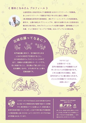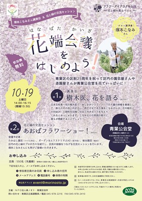 フラワーダイアログあおば10月のプログラム「花端会議をはじめよう!」を青葉公会堂にて開催します!“日本人女性第一号の樹木医”であり、あしかがフラワーパークの大藤の移植を成功させた塚本こなみさんが青葉公会堂にいらっしゃいます!イベント当日は、青葉区制25周年をお祝いして、青葉公会堂がきれいな花でいっぱいに彩られます!皆様のご参加をお待ちしております!