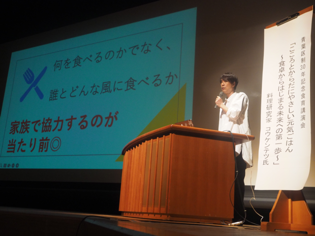 式典の後には、料理研究家のコウケンテツさんを講師に迎え区制30周年記念食育講演会を開催しました。コウさんの話をうかがい、毎日の食事を楽しむだけでなく、作ってくださる方への感謝の大切さを改めて認識しました。私ももちろんのこと、ヘルスメイトさんと参加者の皆様の心に残る1日となったことと思います。