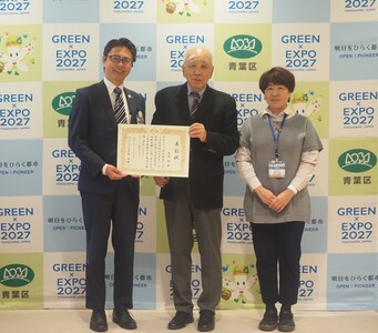 この表彰は、市税の納付意識の向上につながる活動で、功績のあった青葉区の方を表彰しています。今年度は一般社団法人みどり青色申告会 副会長 田村昭様を表彰させていただき、私から表彰状と記念品をお渡ししました。