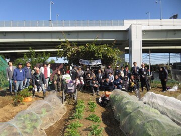 「ふれあい農園事業」は、平成11年度の青葉区制5周年記念事業の一環として、青葉区社会福祉協議会ボランティア連絡会を中心に発足しました。障害者事業所とボランティアが協力し、畑を耕し、苗を植え、無農薬で育てた作物を収穫する取組です。収穫された野菜は、毎月第3木曜日に区役所で開催される「あおばマルシェ」などで販売しています。