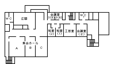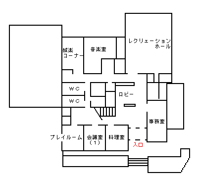施設内容 会議室2・和室・工芸室(音楽室)・料理室・体育室(舞台付き)・グループ室・プレイルーム・図書コーナー・娯楽コーナー