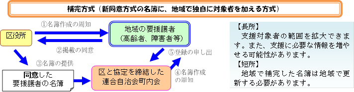 「補完方式」の名簿は、地域独自のアンケートを実施するなど、対象者や集める情報を拡大し、区が提供した災害時要援護者名簿を補完する方式です。