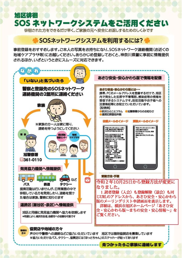 特徴や写真などを事前登録しておくと、ご本人がいなくなった場合、登録情報をもとに発見協力機関(バス、鉄道、タクシー会社、郵便局など)にFAXを送り、日常業務の中での発見協力を依頼することができます。また、あさひ安全・安心かわら版で配信します。
