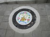 旭区50周年のマンホール!マンホール好きの子なら、にっこり♪旭区の花、朝顔に囲まれて笑顔満開のあさひくん。朝顔の花言葉は、「愛情」「結束」。色によって花言葉は変わるよ。調べてみると面白いかも!