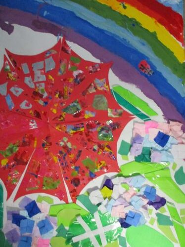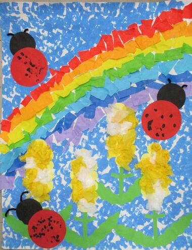 0才児は指スタンプでてんとう虫、1才児は花紙を使って菜の花、2才児は折り紙をちぎって虹を作りました。