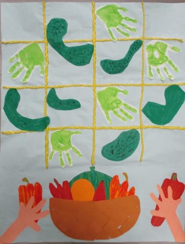 子どもたちと一緒に絵の具で筆や手を使って作りました。