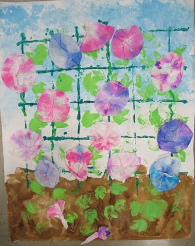 きれいに咲いているアサガオは、和紙を折って染色しました。
