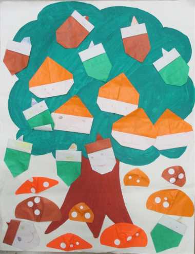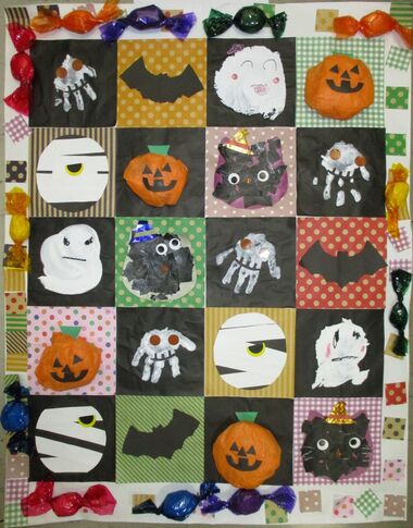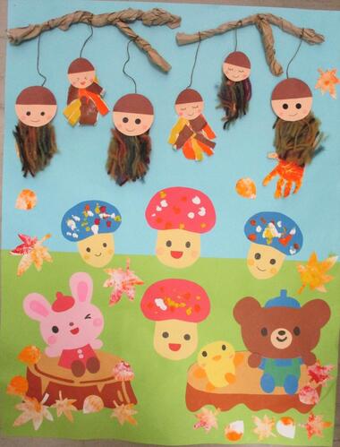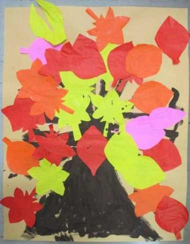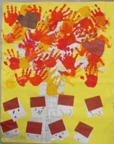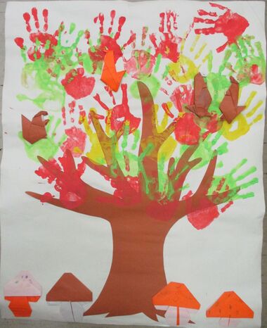 手形スタンプを用いて、色鮮やかな秋の紅葉を表現しました。