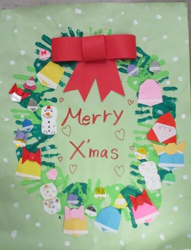 サンタやゆきだるま、ベルなど色や形を工夫し、手型のリースをにぎやかに飾り付け、オリジナルリースを完成させました。