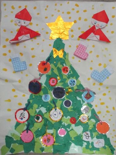 年長クラスはクリスマスツリーをちぎり貼り、冬らしいオーナメントを描きました。