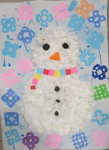 ハサミが上手に使えるようになってきた子どもたちと、切り紙をしてみました。ワクワクしながら紙を広げると、きれいな模様が出来ていて、「雪の結晶みたい!」と声があがりました。雪の結晶に合わせて雪だるまを作ることにしましたが、「ふわふわの雪だるまにしたいね」「どうしたらふわふわになるのかな」とアイディアを出し合い「ティッシュを使うのはどう?」という意見に「いいねー!」とみんなが賛成!