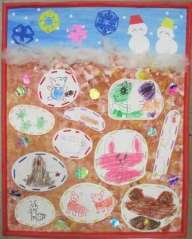 先日の発表会で5歳児が『ちか100かいだてのいえ』の劇を行いました。そこから子どもたちがと話が広がり、“土の中で冬眠している生きものは誰かな?”と一緒に想像を膨らませながら幼児クラスを中心に制作しました。