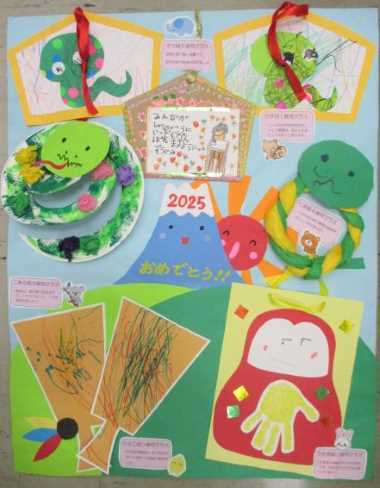 0~5歳児はクラスがそれぞれお正月の製作をしたものをひとつにまとめました。