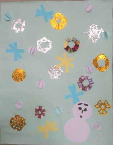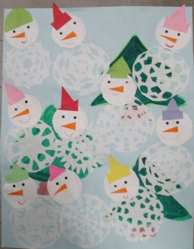 好みの形を描き、一生懸命細かく切り、ひろげ、雪だるまに仕上げました。
