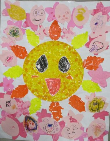 あさひくんの顔は3、4才児クラスの指スタンプ、まわりのはねは、2才児クラスのちぎり絵、そしてまわりの桜の花は0、1才児クラス、みんなで力を合わせてつくりました。