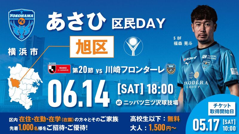 2025年は6月14日(土曜日)の2025明治安田J1リーグ 第20節 川崎フロンターレ戦に横浜市旭区に在住・在勤・在学(在園)の方とそのご家族1,000名様を試合にご招待・ご優待いたします。
