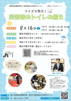 当日は加藤先生によるトイレの重要性に関するお話や、災害時に使用するトイレパックを体験することで、楽しみながら災害時のトイレの備えについて学んでいただきます。