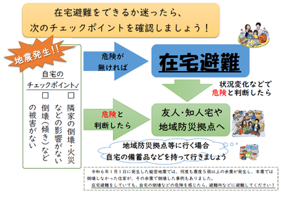 在宅避難をしていても、自宅の倒壊などの危険を感じたら、地域防災拠点などに避難してください。
