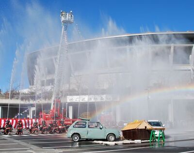 内容:令和7年港北区消防出初式において、車両分列行進、一斉放水及び総合訓練を披露しました。