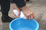 - タオルを水で濡らし、水が垂れない程度に絞りますすぐに濡らしたタオルを取らないでください