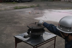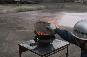 天ぷら油に火が入った場合に、ナベを完全にフタで塞ぎ空気を遮断して消火(窒息消火)する方法です。