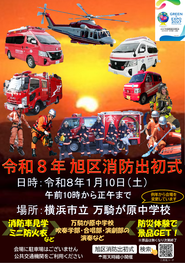 旭区の防災・減災に功労のあった区民や企業に感謝の意を表するとともに、親子で楽しめる防災啓発イベントとして「令和8年旭区消防出初式」を開催します!