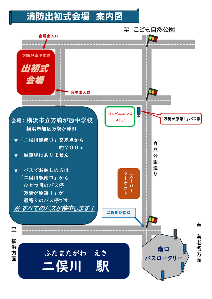 出初式会場の二俣川駅から万騎が原中学校までの案内図