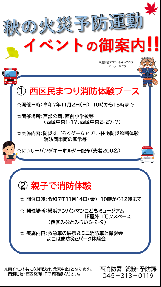 | 電話 | 西消防署総務・予防課予防係予防担当(045-313-0119)までご連絡ください。 |