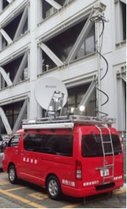 無線中継車は、大規模災害に伴う通信途絶時などにおいて、無線中継装置や衛星を利用して消防本部や消防隊間の通信手段の確保及び通信支援等を行う部隊です。