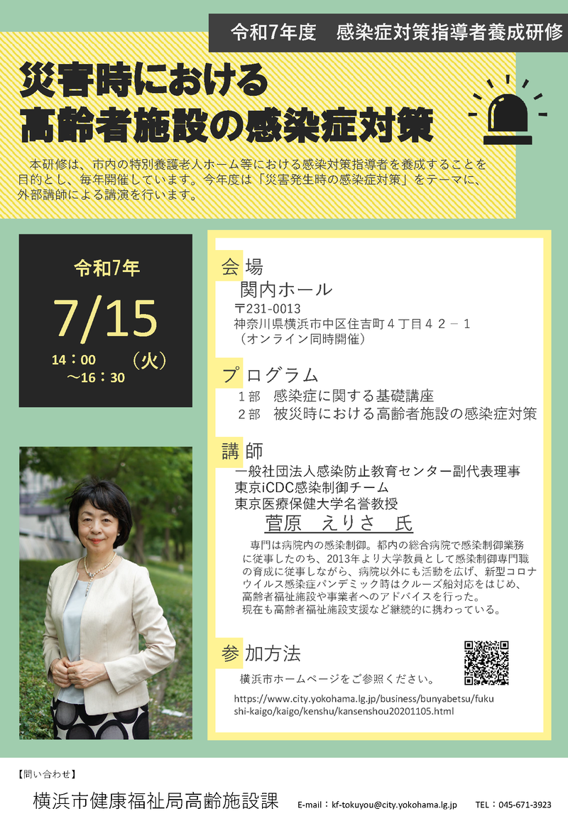 令和7年度感染症対策指導者養成研修は、「非常災害発生時における高齢者施設の感染症対策」をテーマに集合形式で開催いたします。