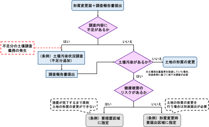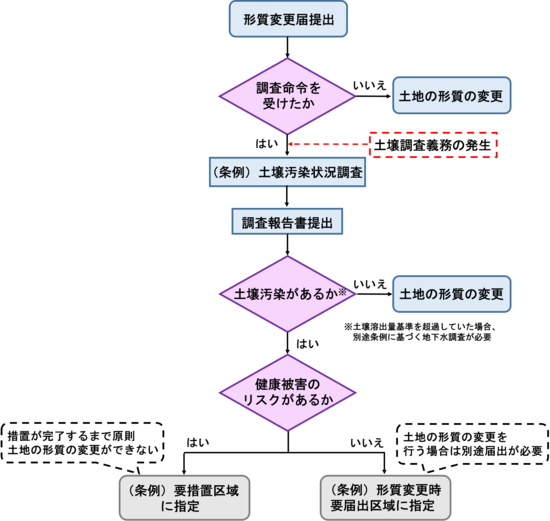 ※法第4条または条例第65条について、土地の所有者全員の同意があれば、土地の形質の変更届と土壌汚染状況調査結果報告書を併せて提出して手続きを短縮することができます。ただし調査結果に不足がある場合や土地の形質の変更届の受理までの間に汚染の上書きがあった場合については、追加で調査命令が出ることがあります。