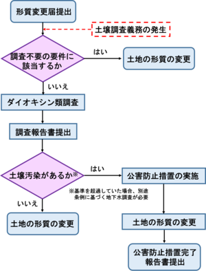 ダイオキシン類管理対象地で土地の形質の変更を行う場合、着手予定日の30日前までに、条例第70条の3に基づく届出をする必要があります。また形質の変更を行う前に当該土地の土壌のダイオキシン類の汚染状況を調査し、報告する必要があります。
