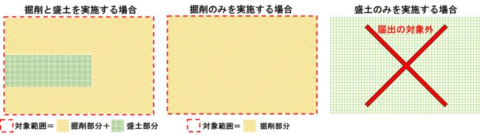 対象となる面積は、盛土と掘削を行う範囲の合計面積です。ただし掘削を伴わない形質の変更は届出の対象外となります。