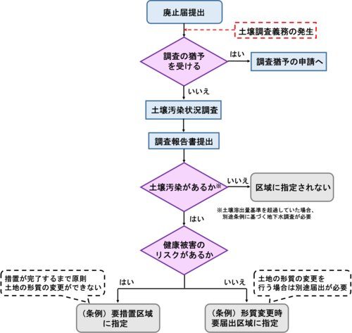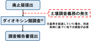 土壌汚染関係の届出、また水質汚濁防止法・下水道法に基づく特定施設の廃止の届出書提出後(当該施設の廃止時にも土壌調査の義務が生じます。)の流れについて説明します。