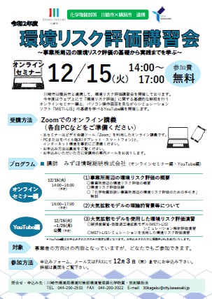 川崎市と連携して、環境リスク評価講習会を開催しました。今年度は、ウェブ上にて「環境リスク評価」に関する基礎的な解説を行うオンラインセミナー編と、パソコン操作画面を見ながらシミュレーションソフト「METI-LIS」の基礎を学べるYouTube編を開催しました。