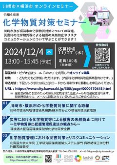 川崎市及び横浜市の化学物質対策についての取組、化管法の観点から災害時の化学物質等による被害の未然防止、化学物質管理における災害対策とリスクコミュニケーションについて、オンライン(Zoom)で講演を行います。