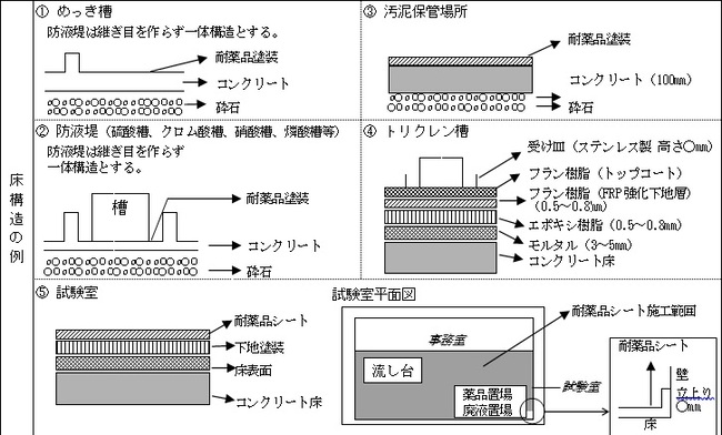 ①床面が地下浸透禁止物質の地下浸透を適切に防止できるコンクリート等の不透水性材質であり、その表面に取り扱う地下浸透禁止物質の種類・性状により必要に応じて耐薬品性のある材質で被覆がなされていること又は当該作業に係る施設の下に地下浸透を防止することができる材質の受皿を設置するなどの地下浸透禁止物質の浸透を防止する措置がとられていること。(施行規則第36条第1号)