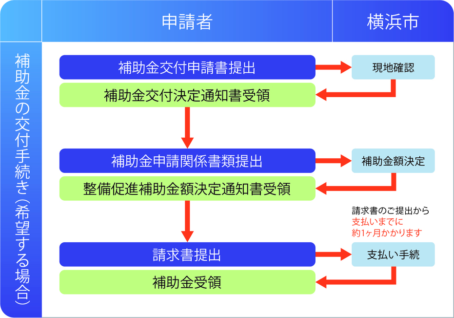 横浜市が現地確認を行い、整備が完了していることを確認して交付決定を行います。