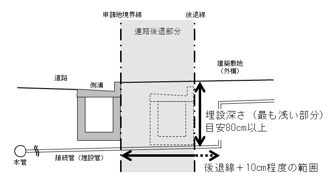 | 埋設物の埋設深さの確認 | ・後退用地内の埋設管の埋設深さについて、舗装工事に影響がない深さ(目安約80㎝以上:下図参照)が確保できている。 |