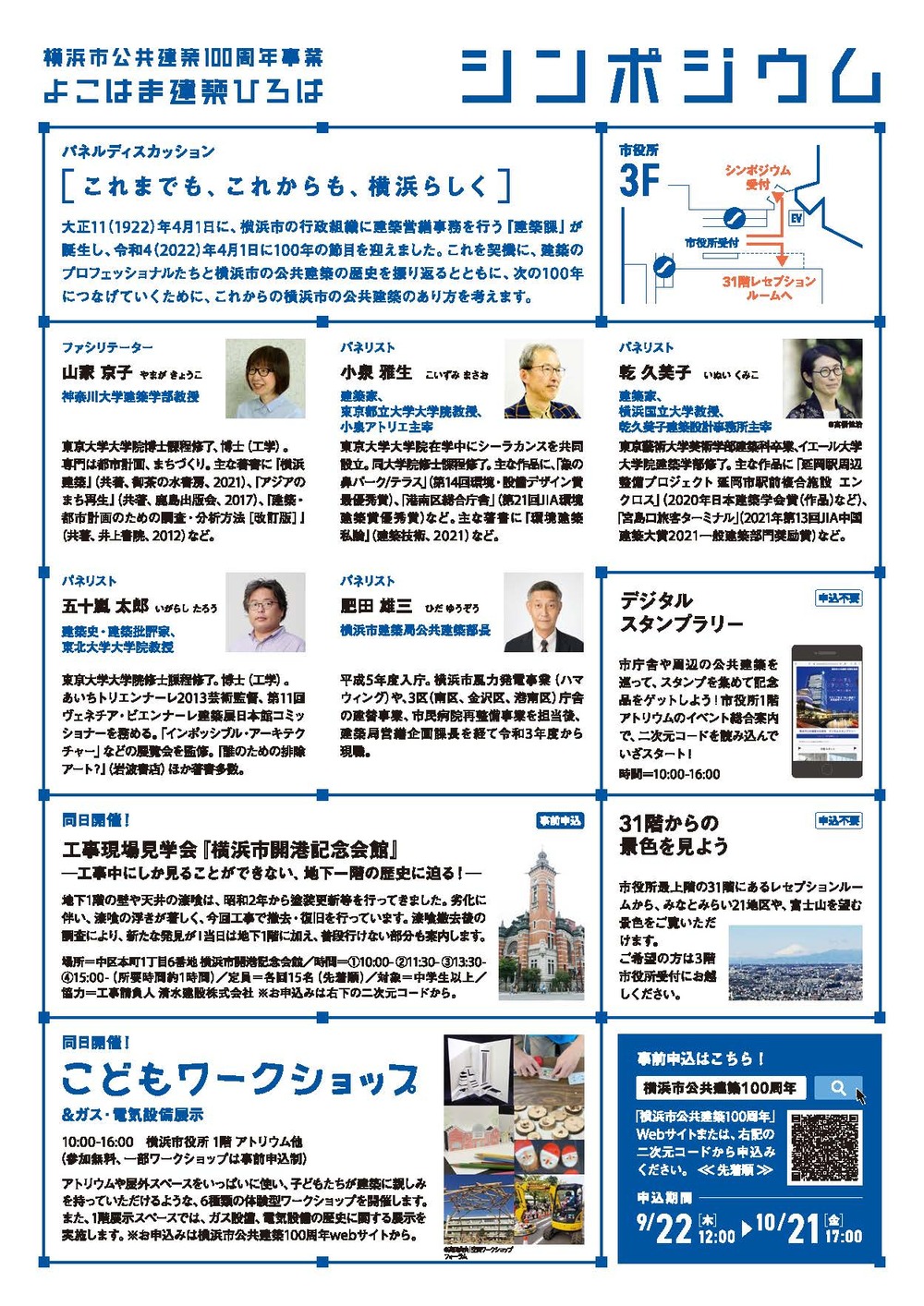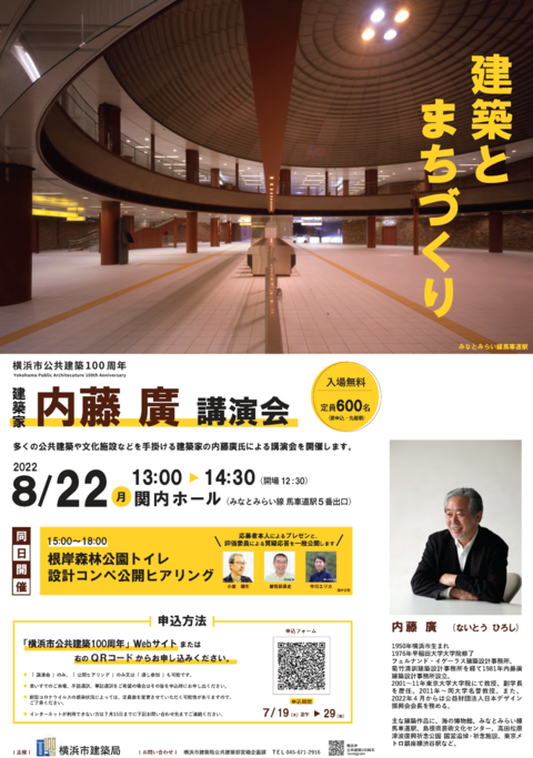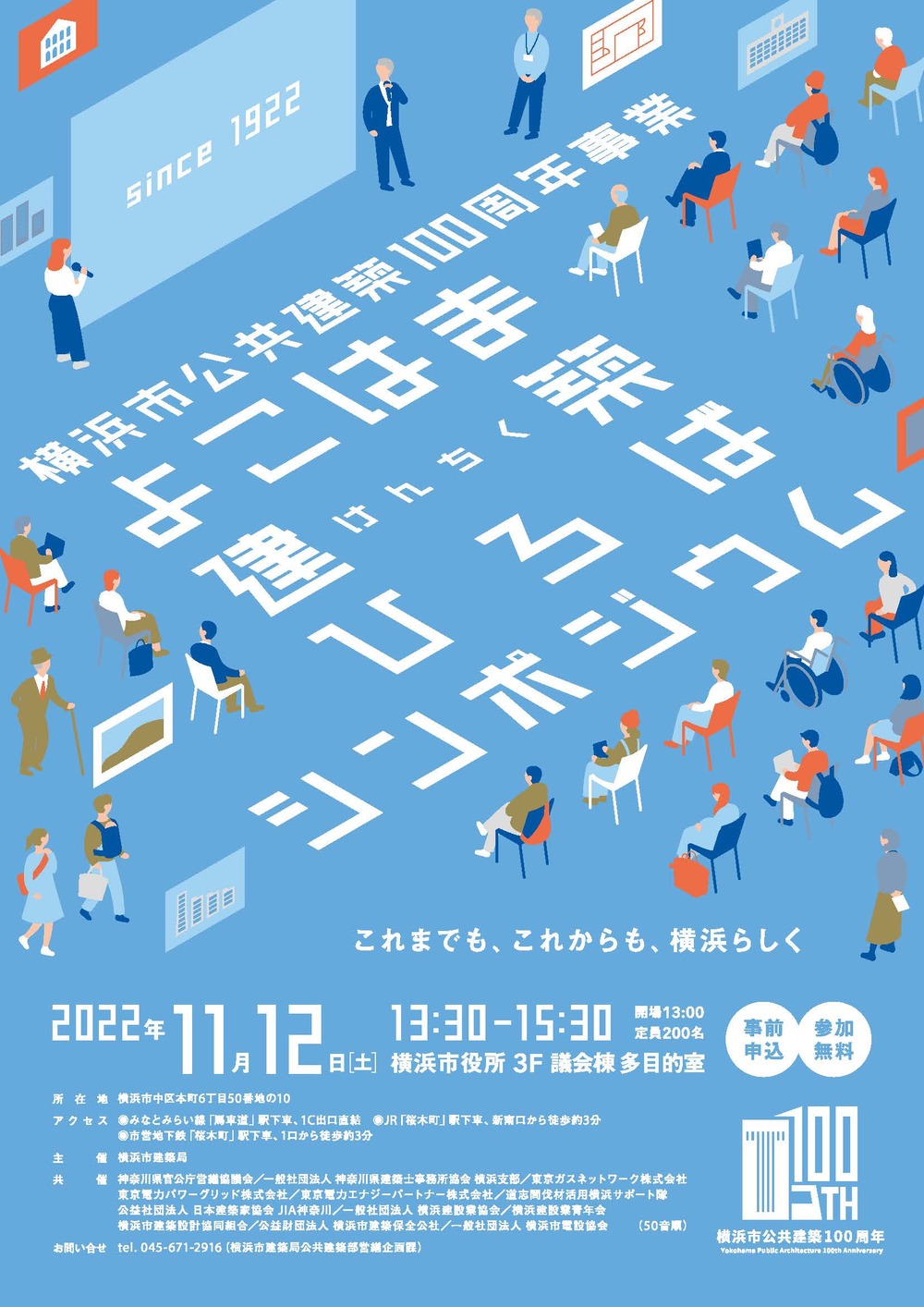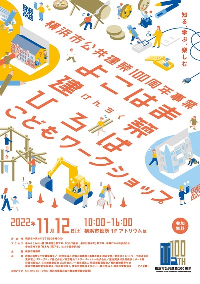 大正11年4月1日に、横浜市の行政組織に建築営繕事務を行う『建築課』が誕生し、令和4年4月1日に100年の節目を迎えました。これを契機に、建築のプロフェッショナルたちと横浜市の公共建築の歴史を振り返るとともに、次の100年につなげていくために、これからの横浜市の公共建築のあり方を考えます。